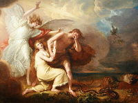 In a melodramatic motion, once again the expulsion of Adam & Eve from Paradise is portrayed... West Benjamin depicts “the...