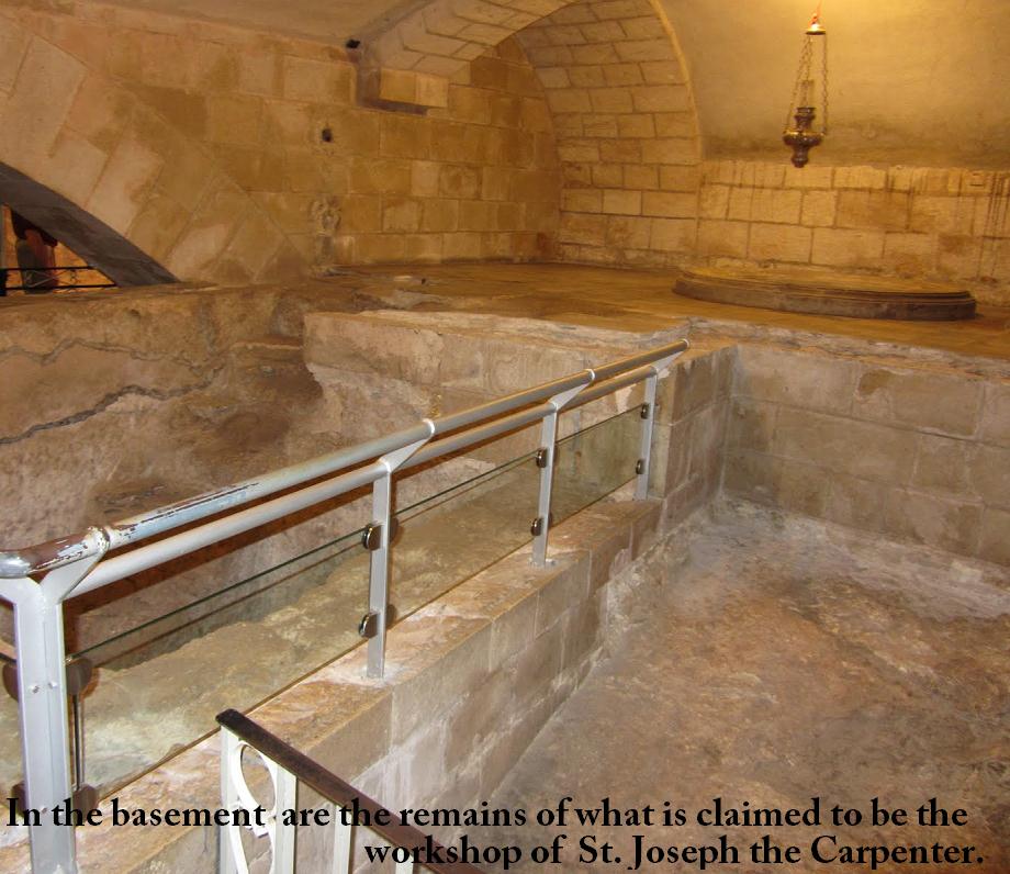 9 stairs lead the visitor to a lower floor, where the crypt holding archeological remains from the Old Nazareth village, is as well the cave used by St. Joseph: where he performed his daily activity in a sanctifying spirit escorted by the divine Son.