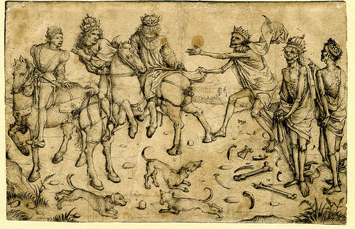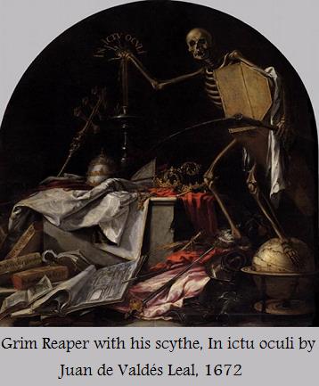 The Concept of “memento mori” was frequently used in Christian Art, especially after the onset of the black plague in medieval Europe. Striking iconographic symbols were the hourglass, the skull, the Grim Reaper with his scythe, and a decayed corpse pictured as a skeleton.